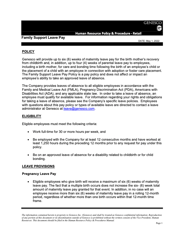 *Both maternity and Parental Leave may only be used once per rolling 12-month period. Additional restrictions apply, please review the full policy document attached below.