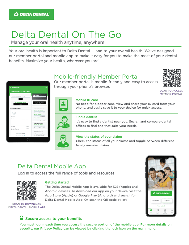 Donʼt forget about Delta Dentalʼs online Consumer Toolkit. You can find a dentist, check benefits, select paperless notices, review claims, print ID cards, and more – all at your own convenience.