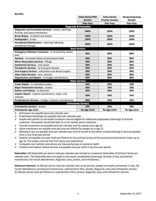 Deductible: $50 Deductible per person total per calendar year limited to a maximum Deductible of $150 per family per calendar year. The Deductible does not apply to oral exams, prophylaxes (cleanings), fluoride, X-rays, periodontal maintenance, full mouth debridement, diagnostic casts, photos, and orthodontics.