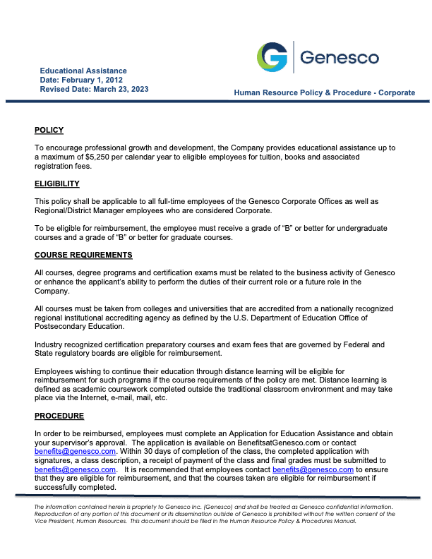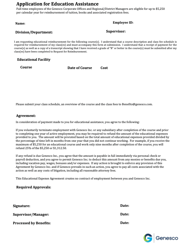 - Within 30 days of completion of the class, the completed application with signatures, a class description, a receipt of payment of the class and final grades must be submitted to benefits@genesco.com.