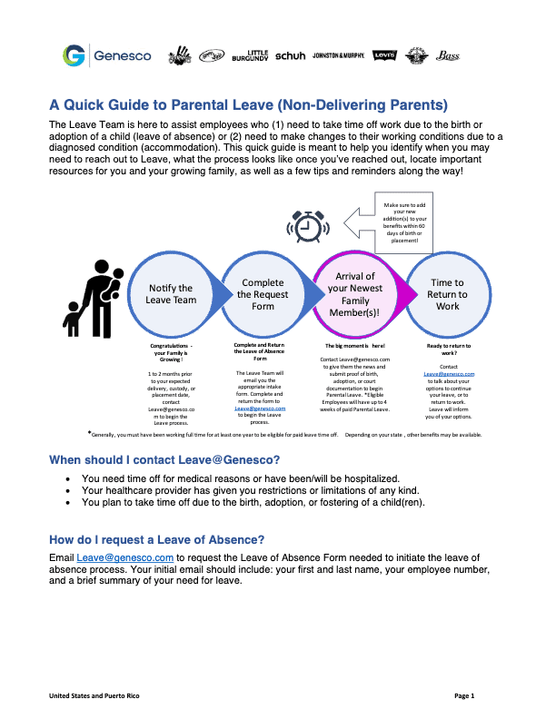 Roughly 2 months prior to estimated delivery date, please reach out to Leave@genesco.com to request your Parental Leave. The Leave Department will send out the Leave of Absence Form for completion to obtain further information on your leave of absence and determine eligibility. You will need to email leave@genesco.com on the date you begin your leave of absence to ensure that you are paid out appropriately for your Parental Leave.