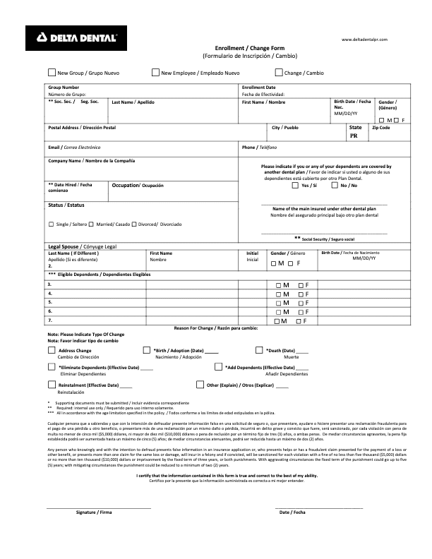 Delta Dental of Puerto Rico Enrollment Form/Formulario de Inscripción de Delta Dental de Puerto Rico