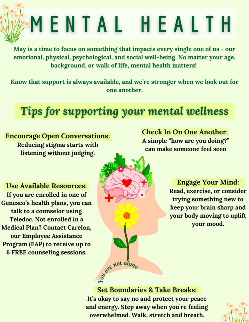The Employee Assistance Program is confidential and free for all Genesco employees. Not only can you and any member of your household receive up to 6 FREE counseling sessions each, but the EAP also offers tools to help recognize the signs of poor mental health, and conversation guides on how to talk with friends, family, and co-workers that you may be concerned about. Talking about mental health can be scarry, but it doesn’t have to be. Click here for more information about our EAP!